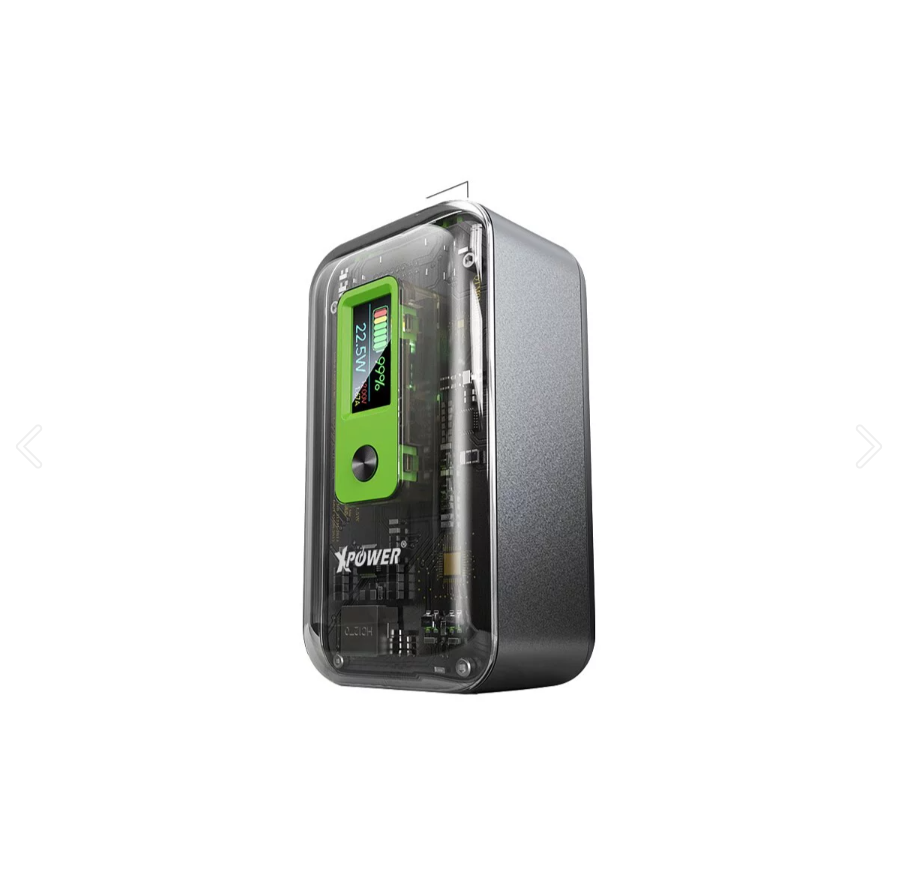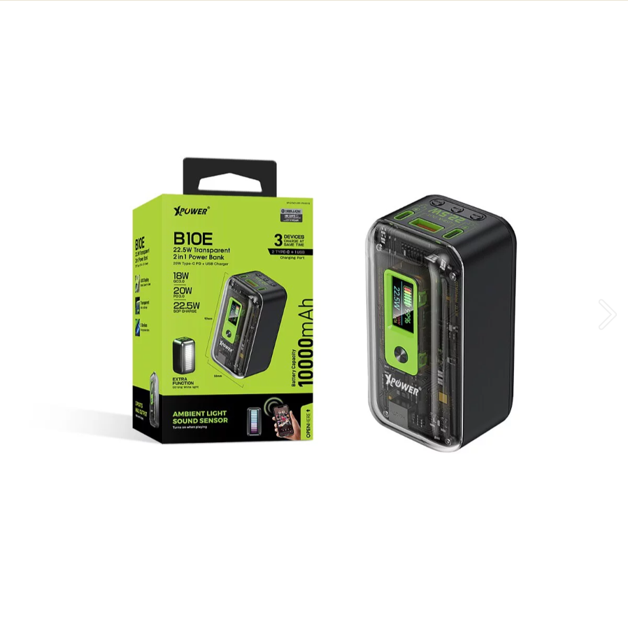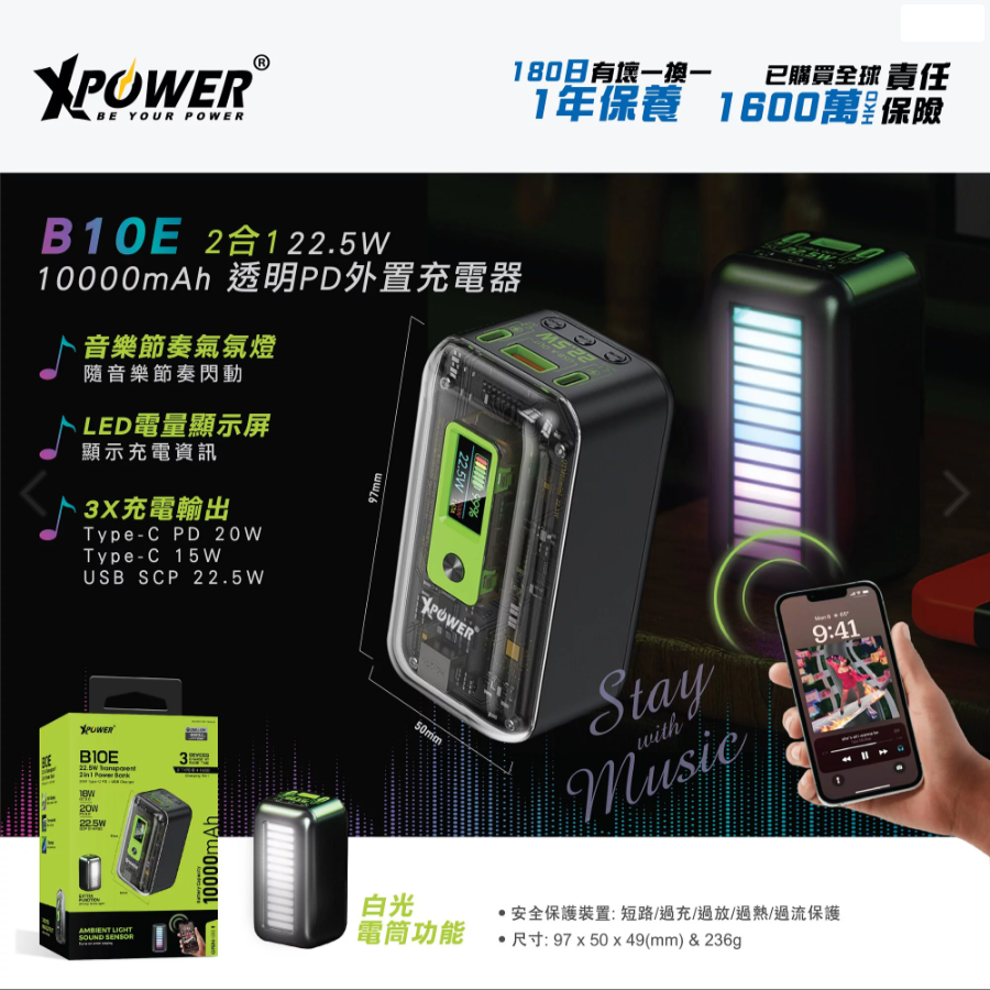 XPower B10E 2合1 10000mAh透明PD外置充電器 (內置音樂節奏氣氛燈) 產品特色: •型格透明設計 •音樂節奏氣氛燈,加強音樂及電競氣氛 •3 x 輸出: Type-C PD 20W,Type-C 15W & USB SCP 22.5W •Type-C PD 20W 輸入 •LED電量顯示屏 •白光電筒功能 •10,000mAh 大容量電池 •安全保護裝置: 短路/過充/過放/過熱/過流保護 •尺寸: 97 x 50 x 49(mm) & 236g