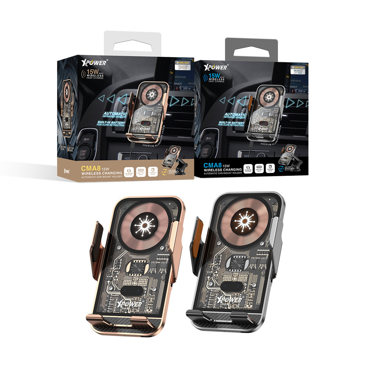 •紅外線感應自動鎖緊及輕按自動釋放 •支援15W無線快充 •2合1套裝:冷氣風口夾及玻璃吸盤 •自動調節手機夾,支援不同尺寸之手機 •360°旋轉設計 •防刮透明玻璃面及高級鋁合金外殼 •支援Type-C輸入 •內置電池,無需著車亦可釋放手機 •安全認證: CE,FCC,ROHS •支架尺寸: 111x70x46(mm) & 112g