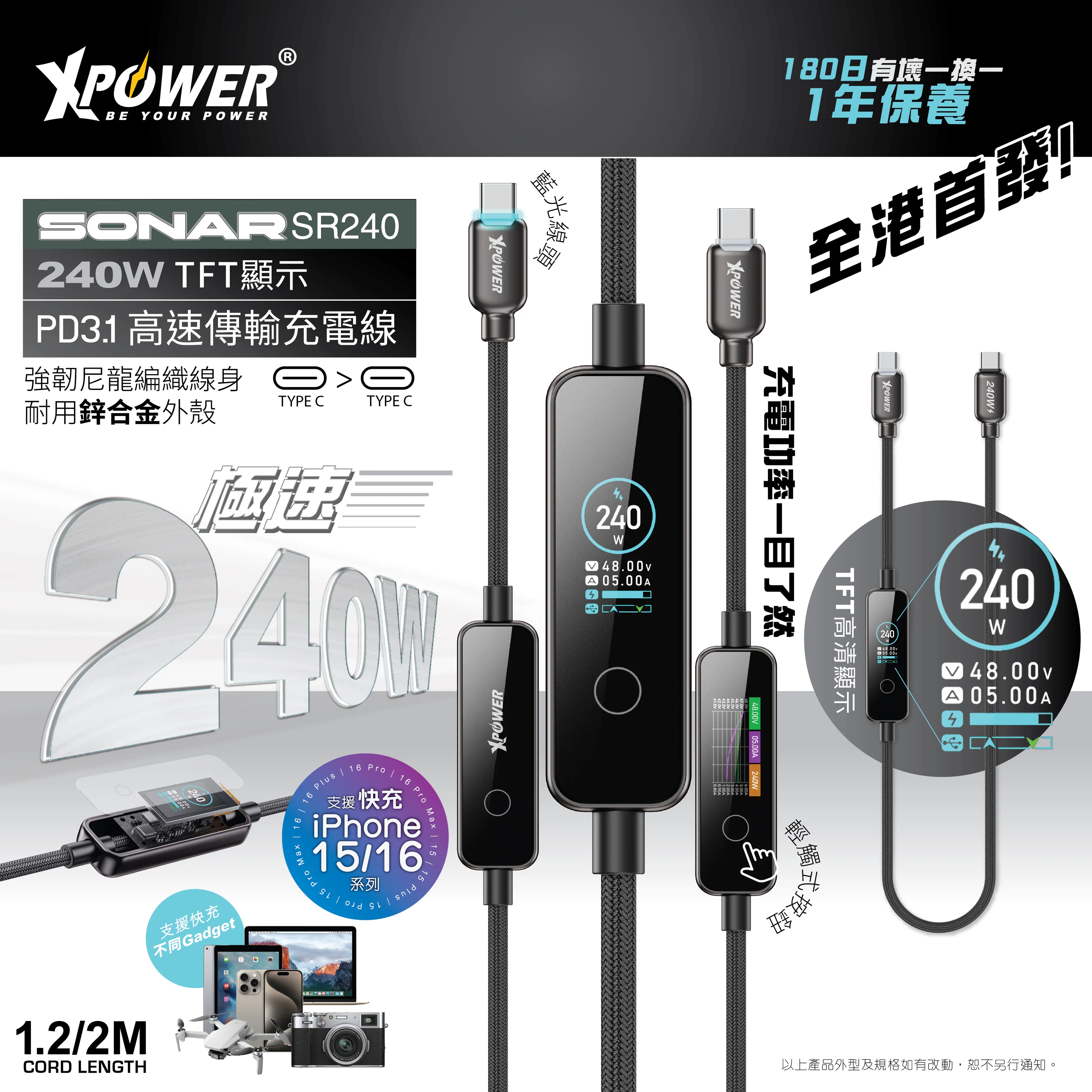 XPower SONAR SR240 TFT顯示鋅合金 240W PD3.1高速傳輸充電線