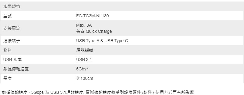 ID: TC3M-NL130• USB-A 至 USB-C 連接線• 支援充電及數據傳輸• USB 3.1 規格• 支援高達 5Gbps 數據傳輸• 支援3A高速充電 • 鋁金屬外殼配合尼龍編織線材• 線長: 約130cm
