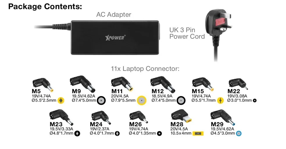 * 輸出: 支援15V~20V, 90W(最高)充電 * 附送11種不同接頭,可充不同品牌之手提電腦,包括Acer, Asus, Dell, Fujistu, HP, Lenovo, Liteon, Samsung, Toshiba等 * 英國規格三腳插電源線 * 安全認證,優質可靠: RoHS, CE, FCC, IEC62368-1, BS1363A * 安全保護裝置: 過載/過流/過壓/短路保護 * 輸入: AC100-240V, 1.5A, 50-60Hz * 尺寸: W50 x H30 x D126(mm) & 234g