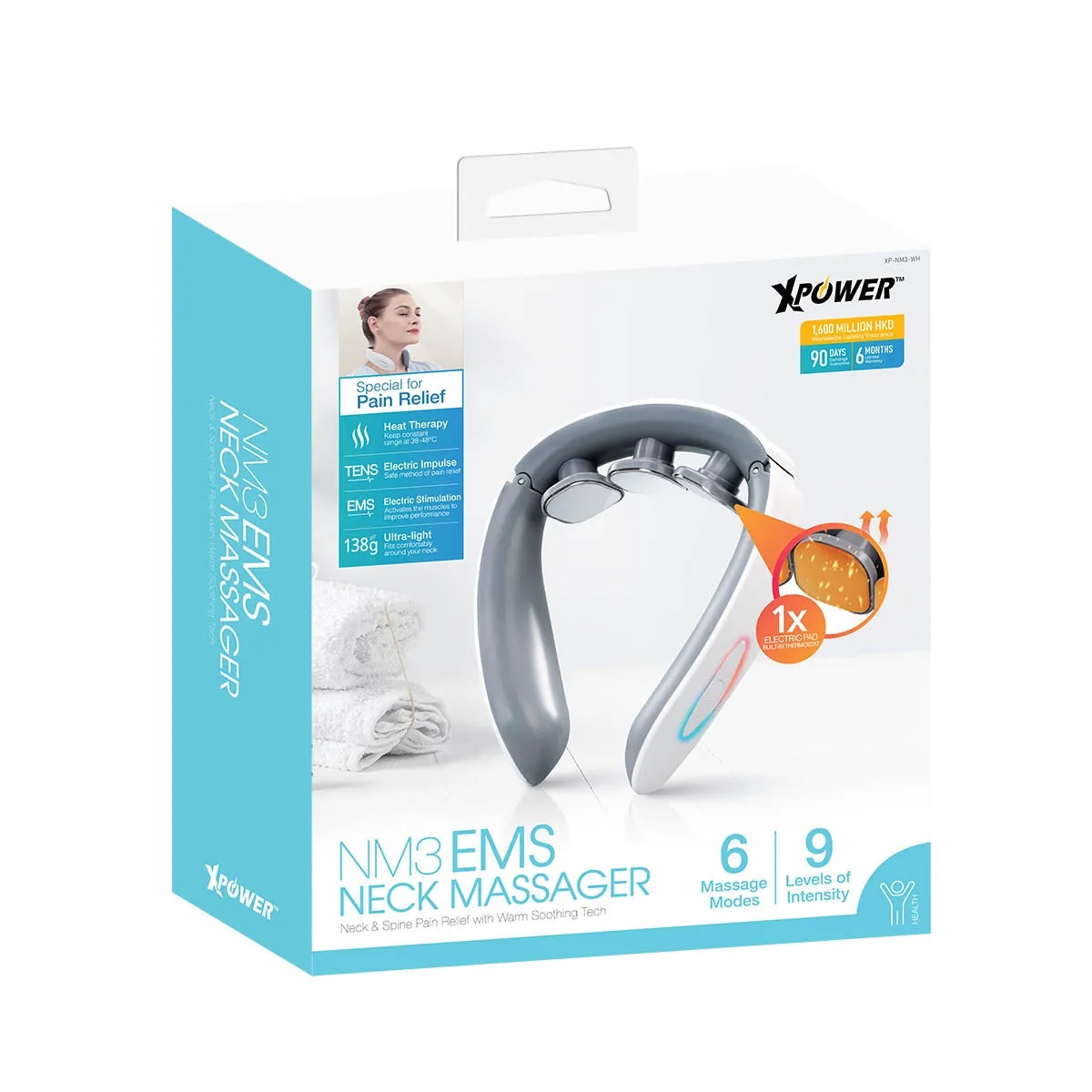 XPower NM3 EMS智能頸椎按摩儀 清新活力的NM3 EMS智能頸椎按摩儀 為您帶來全新的頸部護理體驗!6種智能模擬按摩模式搭配9段力度調節 可模擬刮痧、針灸、推拿等專業手法,有效緩解肌肉酸痛。 內置專利TENS脈衝技術和42℃恆溫遠紅外熱敷,促進血液循環,放鬆頸部肌肉。 人體工學設計只有138g,使用4小時長效續航,安全可靠,為繁忙日子增添一抹身心舒適。 趕緊來體驗頸部SPA,享受專屬無壓力呵護吧!✨💫🌟 •1個脈衝按摩熱敷片 •6種智能模擬按摩模式,9種力度調較: 刮痧、針灸、推拿、拔罐、揼骨、脈衝 •專利TENS脈衝技術,有效舒緩肌肉 •微電流按摩技術,緩解頸椎不適 •42℃恆溫遠紅外熱敷,促進血液循環 • 約15分鐘為一個療程  •人體工學設計,輕巧138g,不添頸部負擔 •特長4小時電量,支援Micro USB充電 •安全認證,優質可靠: CE, FCC, ROHS, PSE •尺寸: 132 x 158 x 45mm & 138g